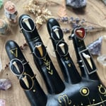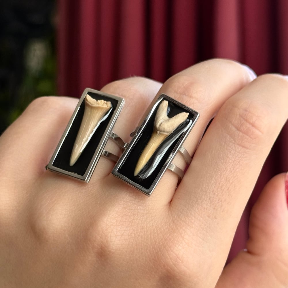 Handmade with ethically sourced shark teeth semi-encased in resin inside adjustable stainless steel rings.